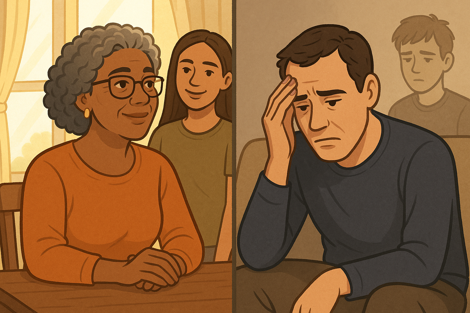 Eli admits that he has been skipping meals, losing sleep, and withdrawing from friends while caring for his son. Maya recognizes these warning signs and gently shares how she once made similar mistakes, normalizing the challenges of self-care in caregiving.