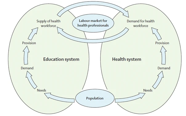 A very important paper - Forecasting imbalances in the global health labor market and devising policy responses by Scheffler et al - suggest that "To deliver essential health services required for the universal health coverage target of the Sustainable Development Goal 3, there will be a need for almost 45 million health workers in 2013 which is projected to reach almost 53 million in 2030 (across 165 countries)." The paper discuss the interaction between the health and education sectors and you can see a diagram from the paper How the labor market for health professionals relates to a country’s education and health care system. The authors continue: "The supply of health workers is a function of the training capacity in a country, net migration, deaths, and retirements." Hence there is a clear relationship between education capacity, the population and the health workforce, as expressed in SDGs 3 and 4.