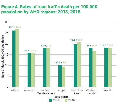 The WHO Global status report on road safety 2018 finds a regional variation in death rates between 9.3 and 26.6 per 100,000 population - with the highest rate in being in Africa. The picture comes from that report: