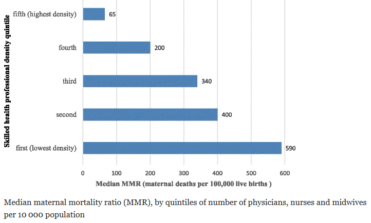 We see large geographical variations in the health workforce, and that maternal mortality is strongly associated with the health workforce density.