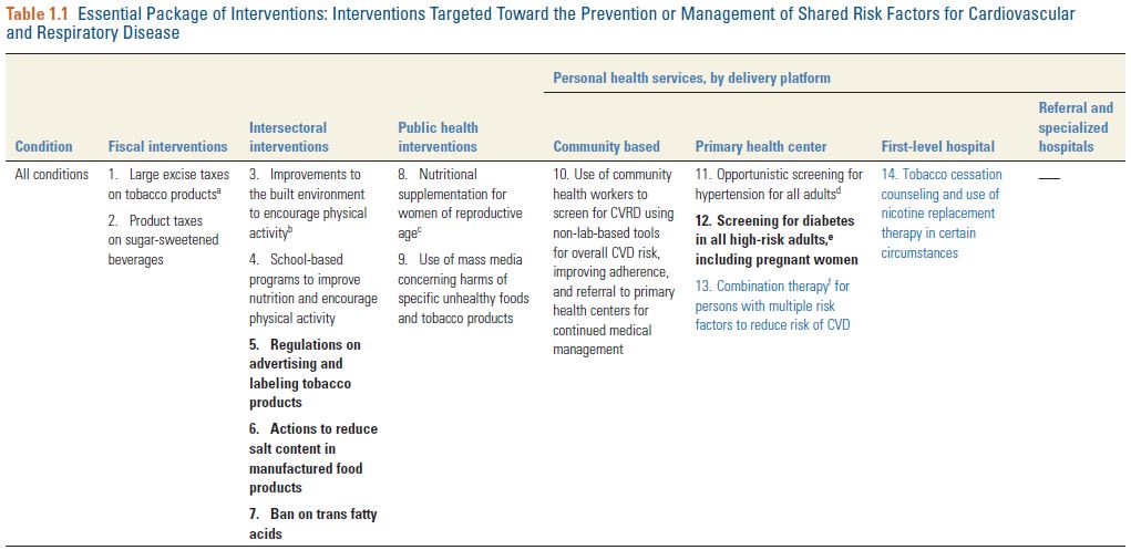 Disease Control Priorities in Developing Countries contains the key resource for this Topic with its review of the evidence for interventions Please look particularly at the chapters on cardiovascular and related diseases - you will find the overview chapter here http://dcp-3.org/chapter/2306/overview and when you click on the sections on the lefthand column you can see each of the chapters. The summary is: